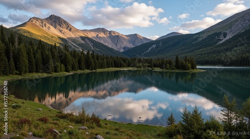 © 秋宇 陈, Fototapeta premium Nature's Reflection Calm Alpine Lake at Sunset