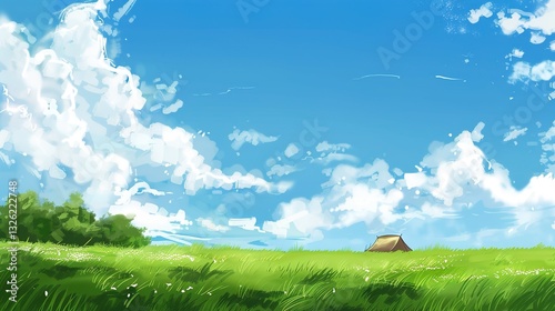 © xu, Fototapeta premium Nature's Retreat: Camping in a Meadow with Clear Sky & Clouds