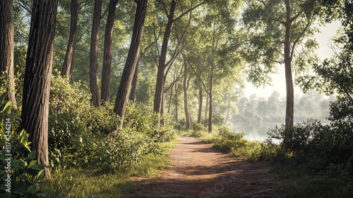 Fototapeta premium Nature’s serenity: Forest trail, vibrant green canopy, and glimmering lakeside reflections