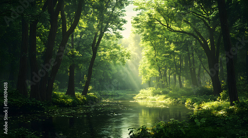 Obraz premium Nature's Tranquil Canopy: A Serene River Journey Through a Verdant Forest's...