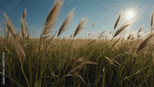 © sndffa14, Obraz premium Nature's Tranquility: Grassy Field at Sunrise