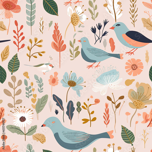© MSHAHID, Fototapeta premium Nature Serenade A calming and soothing pattern with elements like birds, leaves, and soft colors vector art AI Generated