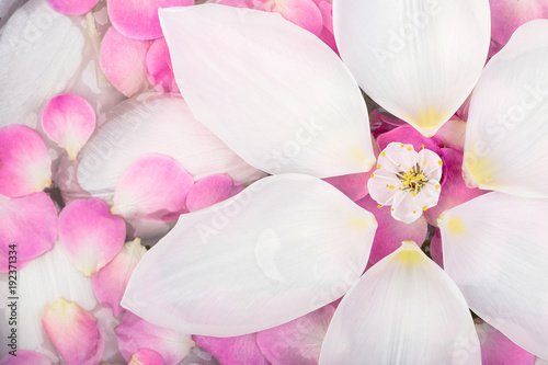 © melnikofd, Obraz premium nature, spring, beauty concept. white petals of tulip are the biggest, they are floating on the surface of water anf composing circle, in the center there is white flower of cherry