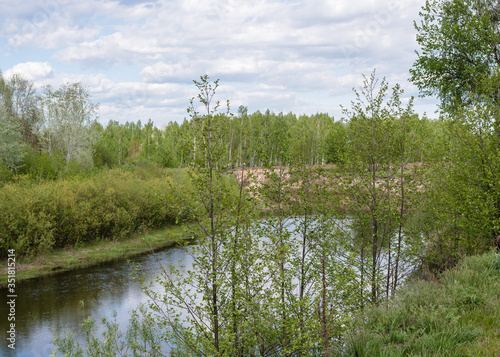 © Julia, Obraz premium Nature summer, Ukraine. River and sandy steep shore, trees around the shore, landscape. Snow River, Ukraine