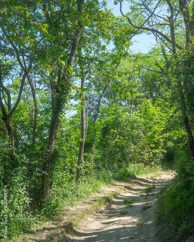 Fototapeta premium Nature trail winding through lush green trees on a sunny day in a peaceful...