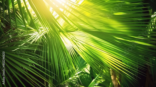 Obraz premium Nature, tropical palm leaves with sun rays in summer, wallpaper background....