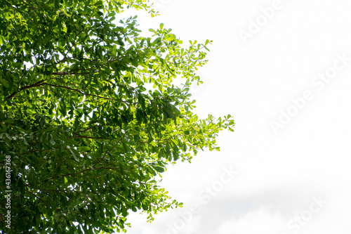 Obraz premium Nature view of Tree branch and Green leaf on white sky background with copy space