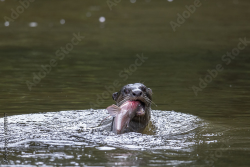 Fototapeta premium Nature wildlife image of wild otter catching fish on a river