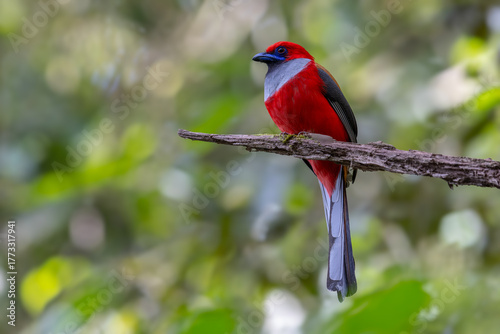 © alenthien, Naklejka premium Nature wildlife of Whitehead's Trogon bird endemic of Borneo perching on a branch in a green forest
