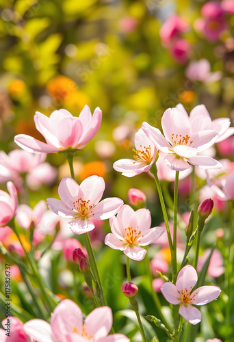 © SusDmi, Naklejka premium Natures beauty in spring, blossoming flowers with fresh and soft petals, a colorful and vibrant garden background in sunlight, Paper Cutout style, with white tones