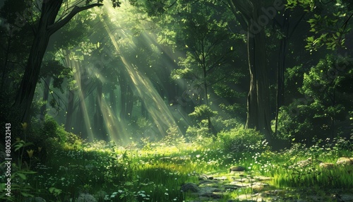 Obraz premium Natures beauty. sunlight filtering through lush green forest on a perfect...
