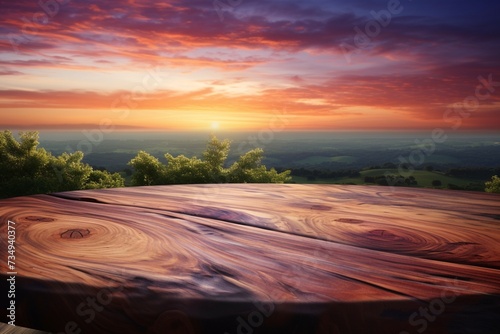 Naklejka premium Natures canvas Wooden table ready for product display at sunset