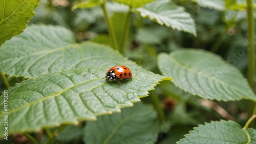 © GMeta, Fototapeta premium Natures Tiny Explorer Ladybug Journey on a Green Leaf