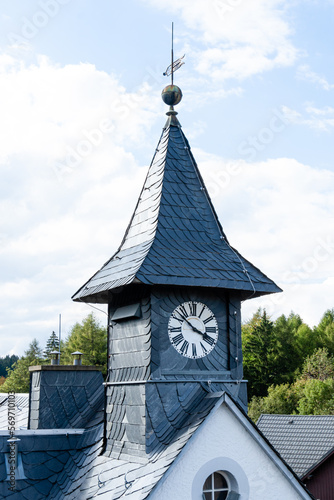 Fototapeta premium Naturschiefer, Schieferdach Eindeckung Dachturm Uhrturm