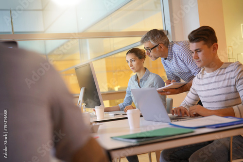 © goodluz, Fototapeta premium Nauczyciel z uczniami na stażu w klasie informatyki