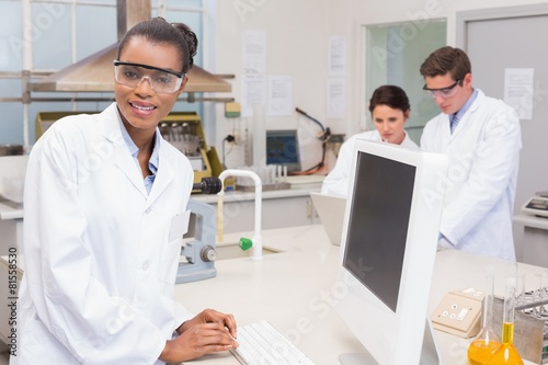 © WavebreakmediaMicro, Fototapeta premium naukowiec uśmiecha się do kamery podczas współpracy kolegów