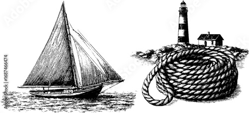 © Artem, Fototapeta premium Nautical adventure theme with sailboat, rope, and lighthouse engraved illustration set for vintage decor