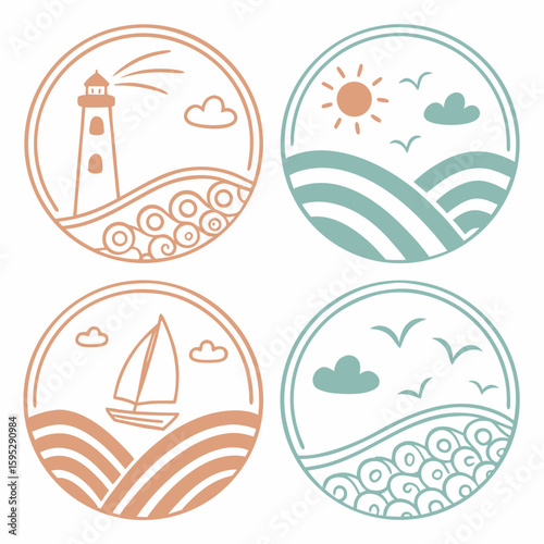 © RABBY MIA, Fototapeta premium Nautical icons lighthouse sailboat sun waves clouds birds vector