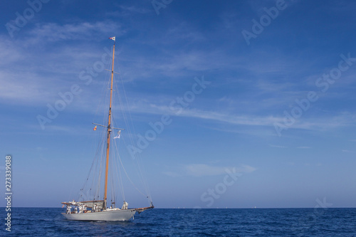 © 19b_production, Naklejka premium Nautical sports in the ocean. Vintage yachts race in Barcelona. Old ships and boats in the sea. Regatta in mediterranean sea. Sails, mast, sheet, canvas in the sky. Holidays in spain.