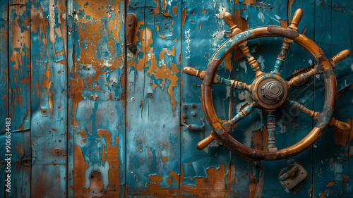 Fototapeta premium Nautical wooden ship steering wheel on old planks