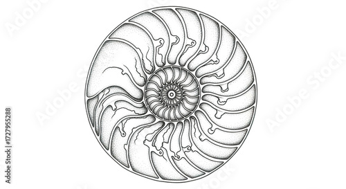 © Sanrecent, Obraz premium Nautilus shell cutaway showing chambers spiral pattern on white background.