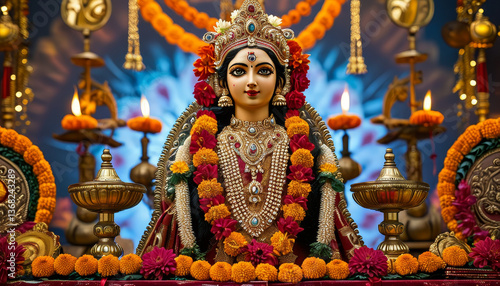 © aiximagination, Fototapeta premium Navaratri product display background podium, Divine Durga Glow, gold and red, Goddess Durga, jewellery and flowers, glowing diyas, oil lamps, temple bells, marigold garlands, sacred, festive ambiance