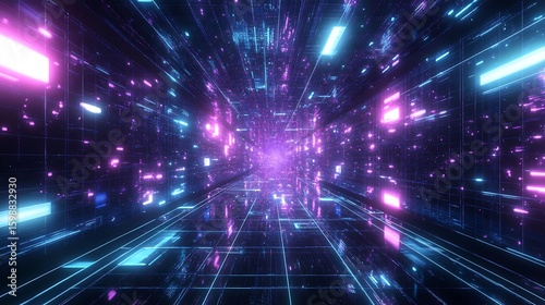 Obraz premium Navigating Abstract Neon Tunnel with Purple and Blue Glowing Lights