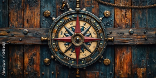 Fototapeta premium Navigating history with a vintage compass against a weathered wooden backdrop...
