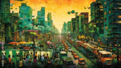 © Alexander Beker, Obraz premium Navigating the Hustle and Bustle: Exploring the Challenges of Busy Traffic in the City