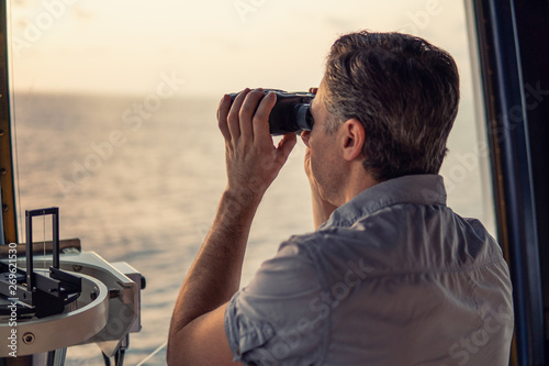© Igor Kardasov, Obraz premium Navigational officer lookout on navigation watch looking through binoculars. Marine industry. COLREG collision regulations