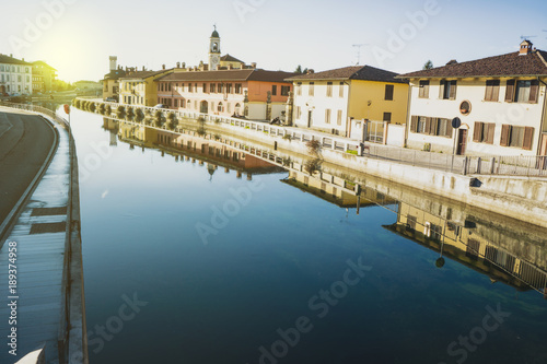 Fototapeta premium Naviglio Grande canal waterway passes near the historic and colorful buildings of Gaggiano (Milan, Italy)
