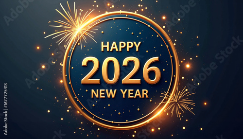 © Olga, Naklejka premium Navy-blue circular badge with gold text celebrating 2026 Happy New Year, adorned with fireworks and lights, designed for festive greetings or promotional materials.
