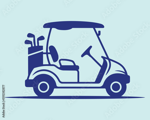 Fototapeta premium Navy Blue Golf Cart Silhouette with Golf Clubs on Light Blue Background