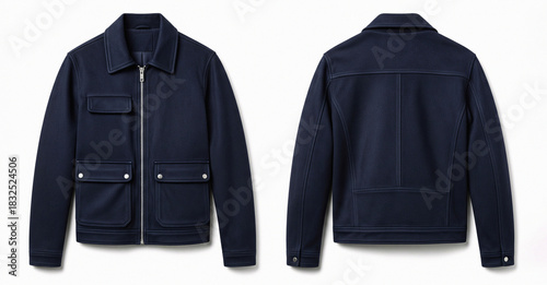 © Drip, Naklejka premium Navy Blue Men's Casual Zip-Up Jacket with Pockets, Front and Back Views Isolated on White