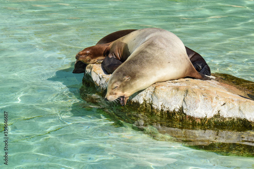© Светлана Беляева, Fototapeta premium Navy seals lying on a rock in the pool