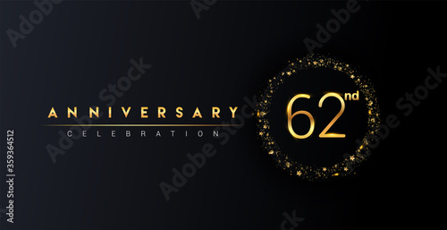 © Vectorideas, Fototapeta premium 62nd anniversary logo with confetti and golden glitter ring isolated on black background, vector design for greeting card and invitation card.