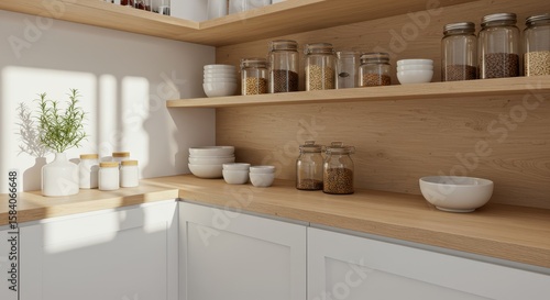Fototapeta premium Neat and Modern Kitchen Shelves Filled with Glass Jars and White Dishware in Bright Natural Light