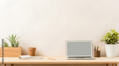 Obraz premium Neat workspace with an open laptop, succulents, and office supplies on a...