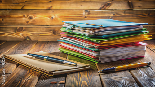 Obraz premium Neatly arranged documents and colorful folders stacked on a rustic wooden...