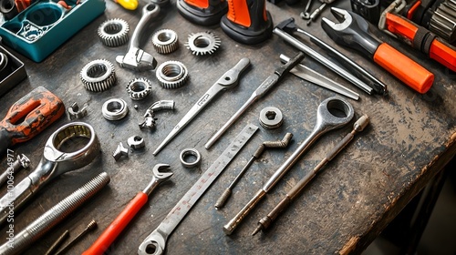 Fototapeta premium Neatly Arranged Set of Tools and Machine Parts on a Workbench