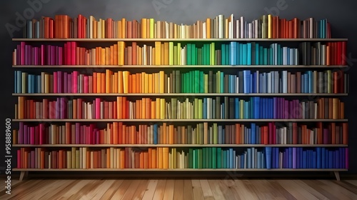 Fototapeta premium neatly organized bookshelf displaying books arranged in a rainbow color gradient, symbolizing creativity and knowledge. Ideal for education, interior decor, and library-themed visuals,