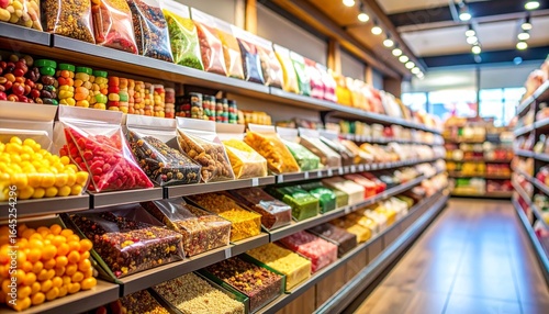 Fototapeta premium "Neatly organized candy jars filled with colorful sweets in bright retail...
