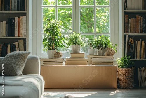 Obraz premium Neatly packed boxes of books and decor in a bright modern interior
