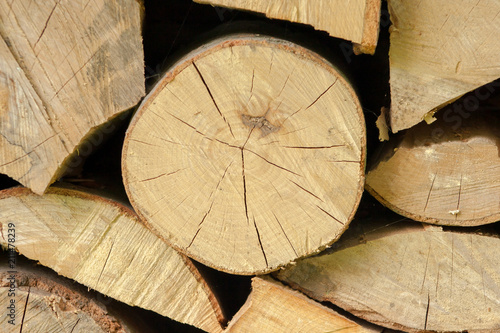© daily_creativity, Naklejka premium Neatly stacked full frame wood beams and branches background texture patterns