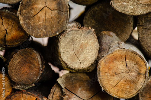 © Elena Nikiforova, Naklejka premium Neatly stacked wooden logs. A lot of cut wood as a background