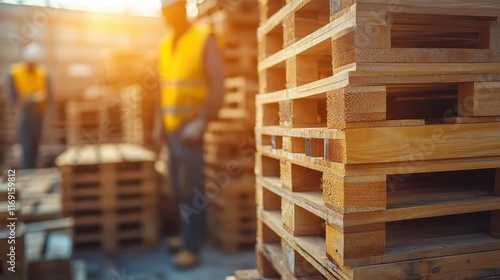 © Photo, Obraz premium Neatly Stacked Wooden Pallets in Natural Light