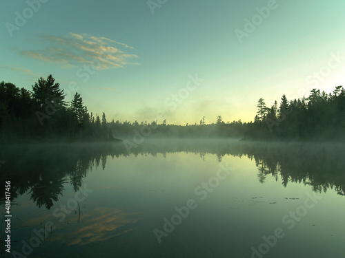 © KorpiKaaos, Fototapeta premium Nebel über See bei Sonnenuntergang in Kanada