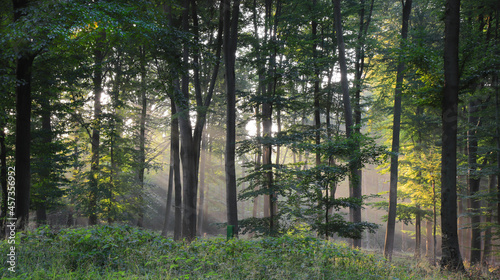 © Stefan Werner, Fototapeta premium Nebel im Wald mit aufgehender Sonne