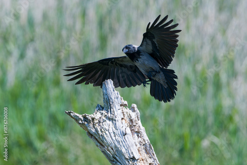 Obraz premium Nebelkrähe bei der Landung auf einen Baumstamm
