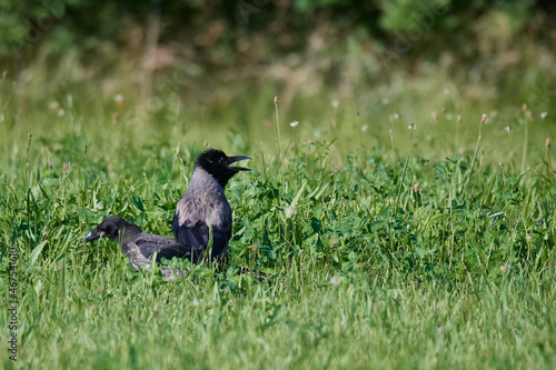 Obraz premium Nebelkrähe mit Jungtier, Aaskrähe (Corvus corone)